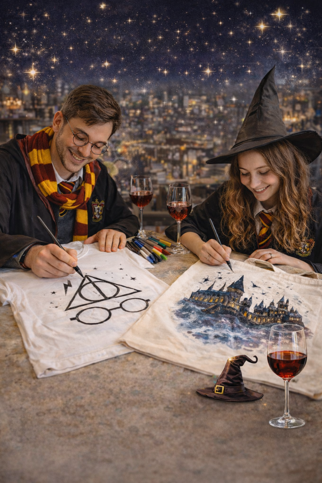 Zapraszamy na magiczny wieczór inspirowany światem Harry'ego Pottera! Podczas warsztatów stworzycie własne magiczne koszulki lub torby – na miejscu wybieracie co chcecie malować. Będziemy odrysowywać kultowe symbole ze świata czarodziejów: błyskawice, okulary, Hogwart i inne magiczne motywy. A żeby atmosfera była jeszcze bardziej magiczna… wino gratis! Mile widziane przebrania – peleryny, różdżki i czarodziejskie akcenty zdecydowanie dodadzą klimatu! Liczba miejsc jest ograniczona – zarezerwuj miejsce zanim zniknie jak po zaklęciu!