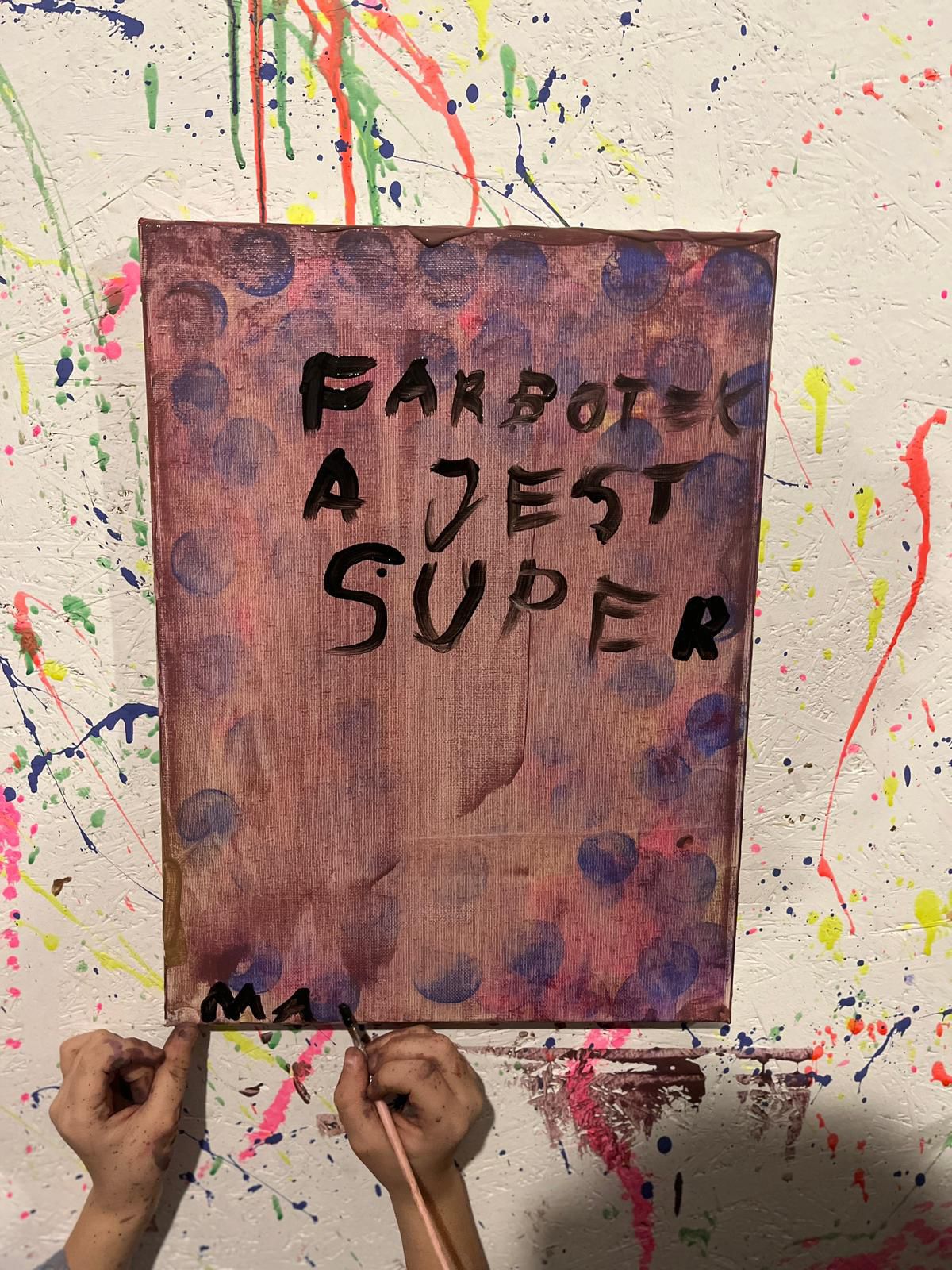 Na początek dzieci wkraczają do naszej pracowni malarskiej, gdzie czeka na nie płótno, zestaw farb i akcesoria.
