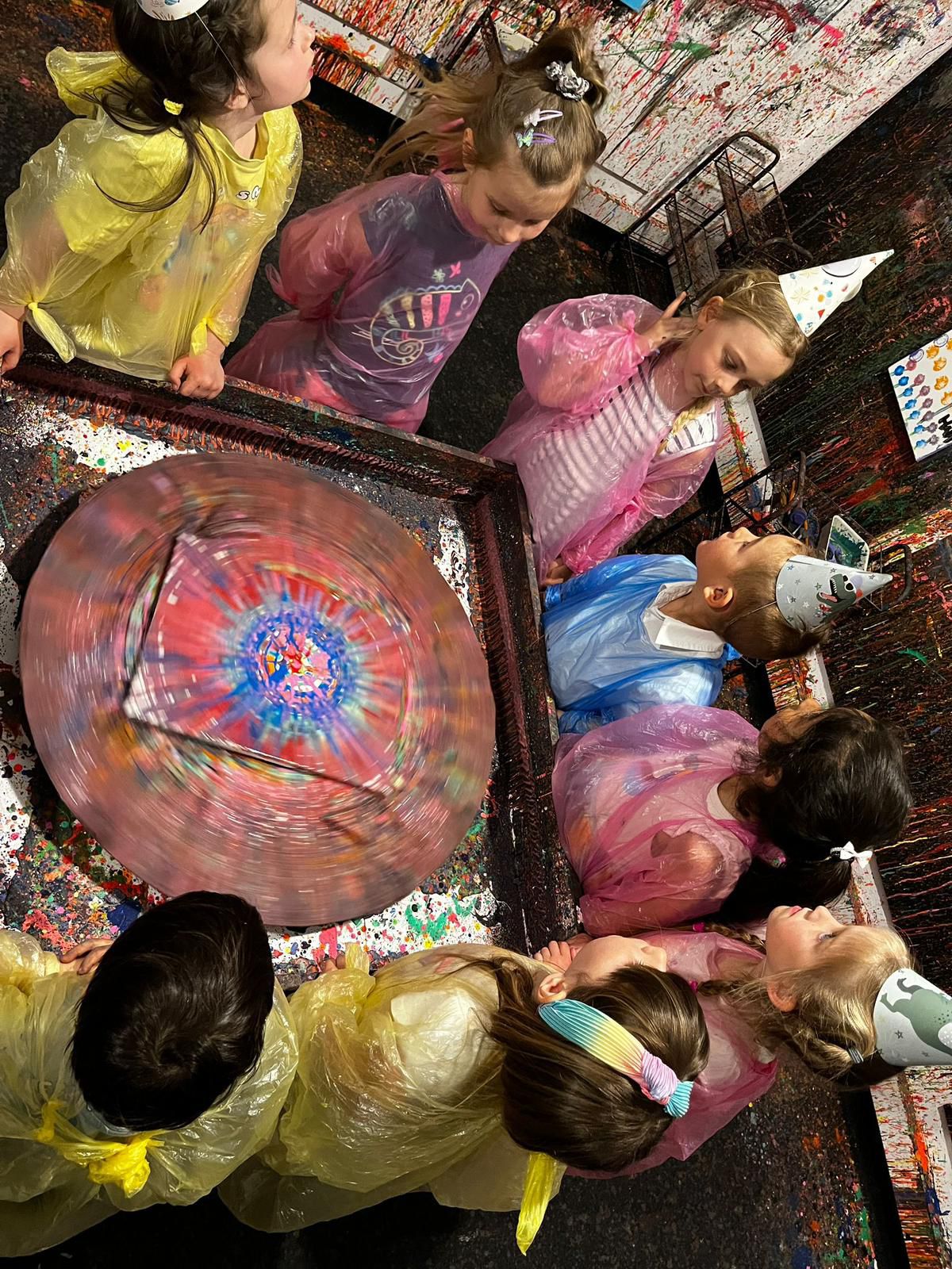 Na koniec włączamy specjalne stoły obrotowe, na których można eksperymentować z ruchem i rozlewaniem farb – to chwila szalonej kreatywności i zabawy, której dzieci nie zapominają. 🌀